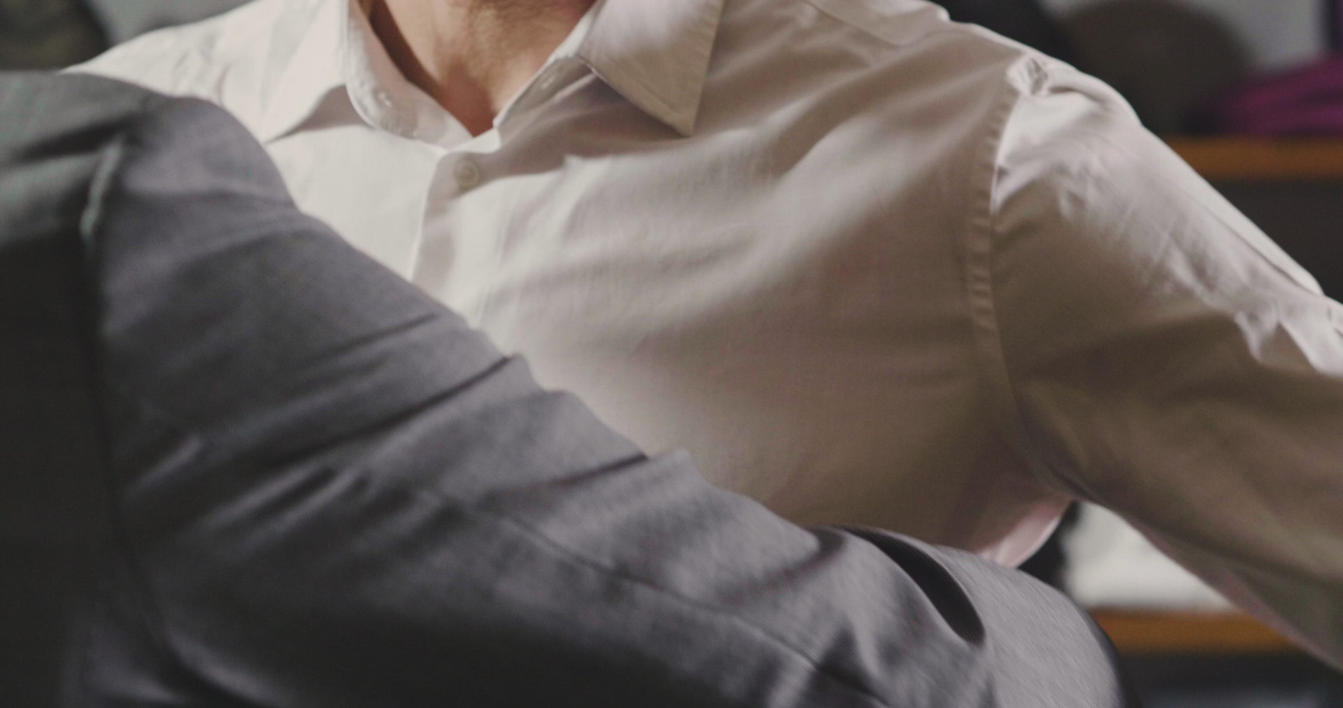 The shoulders are sewn (and pleated) by hand, and the sleeve is fitted "asymmetrically," a sartorial detail that allows for the most comfortable movement possible.